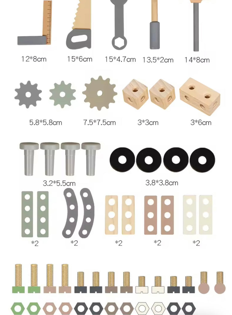 - 🛠 Complete Tool Set: includes saw, wrench, bolts, nuts, gears & wooden accessories